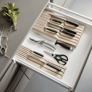 Made from beautiful natural bamboo the Joseph Joseph DrawerStore Knife Organiser Bamboo, a sleek, space-efficient knife organiser designed to safely store your sharp knives while taking up minimal room in your kitchen drawer. With a stylish 2-tier design, it accommodates both small and large knives, up to nine knives (top for small knives, bottom for large knives), ensuring your kitchen remains organized and your blades are protected