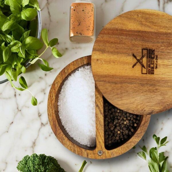 Crafted from acacia wood and split down the middle for salt and pepper perfection, this dual chamber spice pot keeps your essentials within reach and your counters looking sharp. With a swivel lid that seals in freshness and keeps out moisture, itโs functional, fabulous, and totally handcrafted. Add a pinch of luxury to your everyday seasoning.