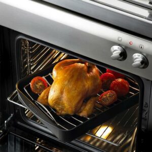 The Scanpan Classic Roasting Pan has so many uses that it is hard to find the right name for it. The pan is easy to clean, even after a couple of hours in the oven. The roasting pan is a multi-purpose kitchen tool, thanks to its special “frying pan base” that can be used in the oven, on the grill and on the cooker.