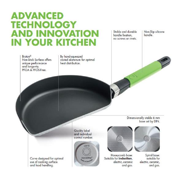 The Squality Biotan Non-Stick Frying Pan is ideal for searing, roasting and frying meat at high temperatures. The curve of the wall is specifically designed to easily manipulate and turn food as delicate as omelettes and pancakes. The squeeze cast aluminum is a great heat conductor and ensures heat distribution and retention, helping save energy.