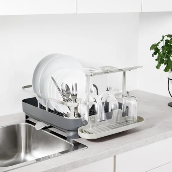 Organise your dishes and hang stemware to dry with this highly functional Umbra Holster Dish Drying Rack.It’s made of molded plastic and has a stainless-steel frame making it both durable and easy to clean. The holster has a 15-plate capacity, utensil storage, moveable stemware holder, a multi-purpose side tray and dual position drain spot. With soft, curved lines, this low profile, molded plastic caddy is a modern but approachable piece for everyday kitchen use