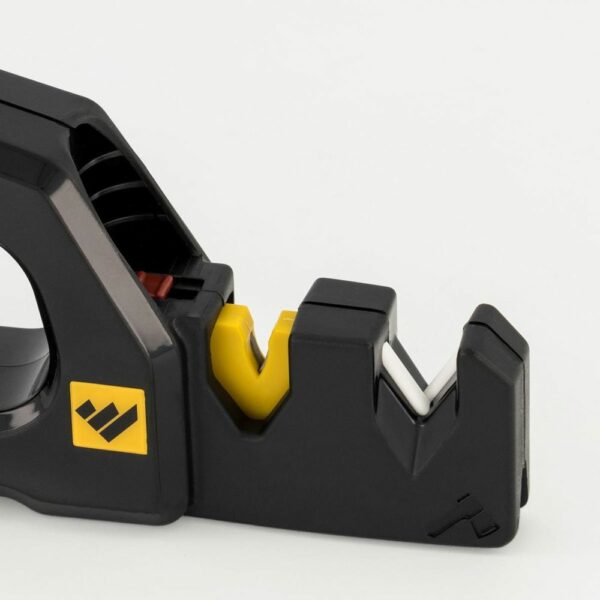 The Convex-Carbideยฎ sharpening stage swiftly restores a sharp edge, while the ceramic hone eliminates burrs for pristine cutting performance. With a simple slot-and-pull motion, your knives are ready to tackle any task in no time. Need to sharpen your axe? The carbide slot on the front makes it a breeze. Plus, the carbide scissor sharpener conveniently stows in the handle for fast touch-ups.