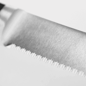 - The ultra‑sharp serrated stainless steel blade delivers consistent cuts through bread crusts, deli meats, and hard cheeses