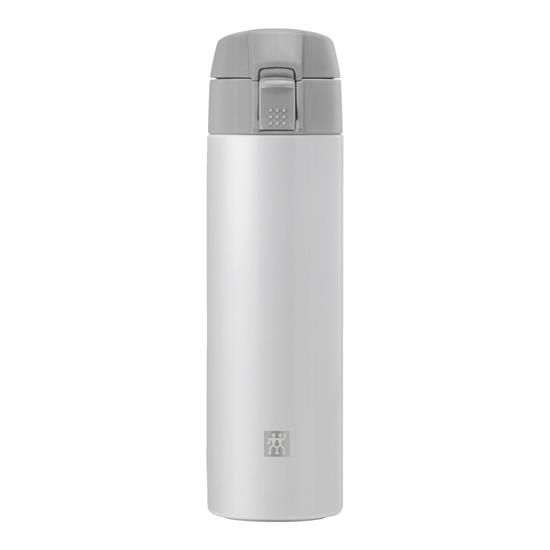 Available in silver-white and black matte, this attractive bottle is a stylish way to take drinks on the go. The double-walled insulation keeps its contents hot or cold for a long time. The Thermo product is 100% leakproof, dishwasher safe, and features an anti-slip base. Made from 18/10 stainless steel, BPA-free plastic, and silicone.
